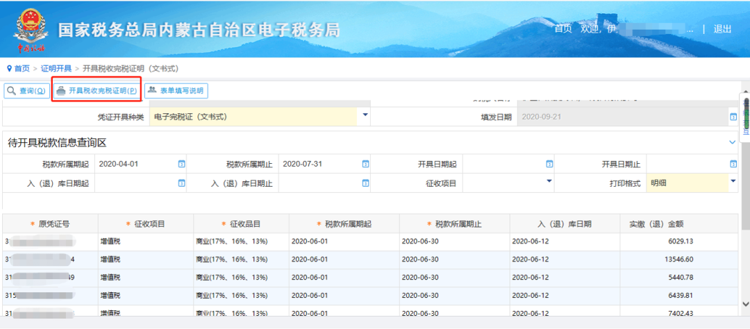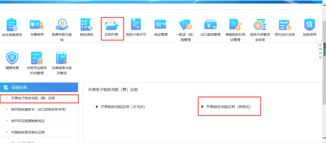 点击“【我要办税】-【证明开具】-【开具电子税收完税(费)证明】-【开具电子税收完税证明(表格式)】”。