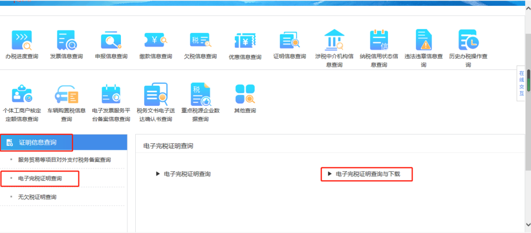 点击“【我要查询】-【证明信息查询】-【电子完税证明查询】-【电子完税证查询与下载】”。