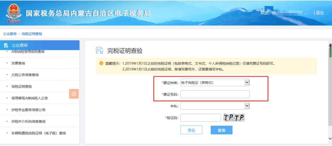 点击【公众服务】-【公众查询】-【完税证明查验】。