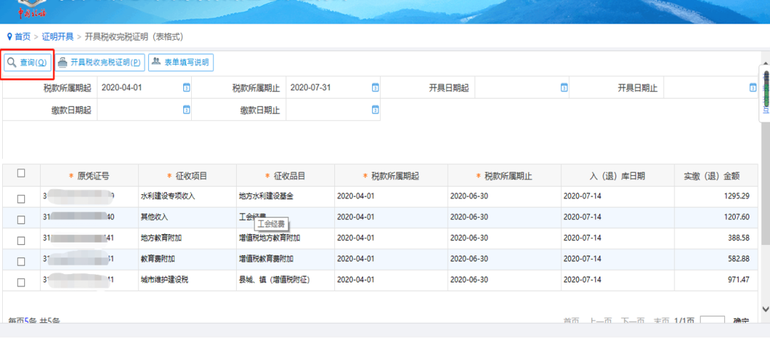 点击【查验】之后,下方会有完税证明信息显示供纳税人查验。