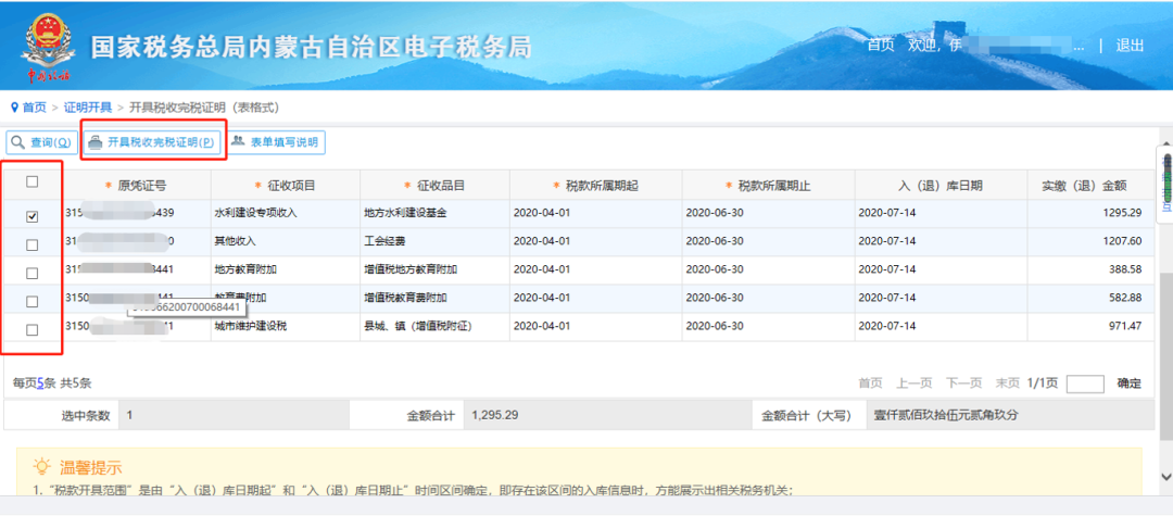 选择所需要的开具的条目,点击小方格,‘√’代表选中,点击【开具税收完税证明】即可。