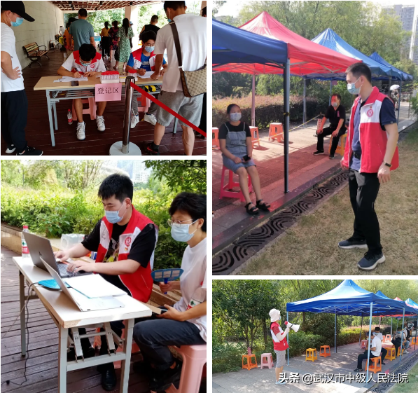 自8月3日江汉区根据全市统一部署启动全民核酸检测以来,武汉市江汉区人民法院闻令而动,迅速动员组织党员干部下沉社区,协助全民核酸检测工作。截至8月6日,江汉区法院领导干部带头,11个在职党支部80余名党员下沉到汉兴街民航、常四、红梅里、水仙里4个社区,冒着酷暑,累计下沉时长250多小时,宣传动员核酸检测、协助登记居民信息、维护现场秩序,助力社区核酸检测工作有序开展。白天穿着法袍开庭审判,晚上换上红马甲志愿服务,有的同志连续工作12小时以上。
