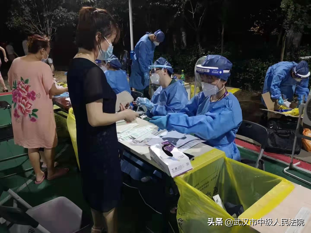 法院干警在医护人员的指导下穿好防护装备,经过简单的现场培训,就上场配合医生完成采样登记、样本收集工作。一直到深夜,还有居民陆续来到检测点,但是下沉的江汉区法院员们依然顽强坚守,与医护人员共同完成了连续8小时4000余人的核酸检测样本采集工作,一直持续到6日凌晨2点。直到工作结束,大家脱下装备,才发现汗水早已湿透了衣背,戴的橡胶手套里积满了汗水。