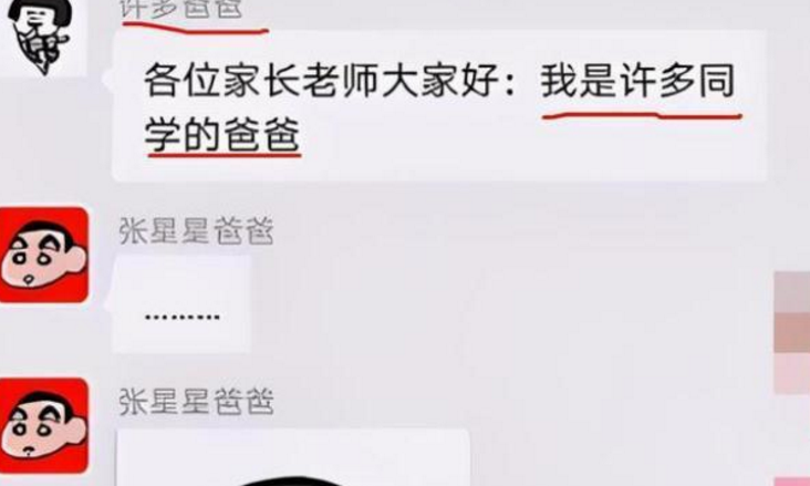 这位家长在自我介绍的时候就很引人注目,这位家长在群里的备注就是“许多同学的爸爸”不知道的人以为这位家长占便宜。