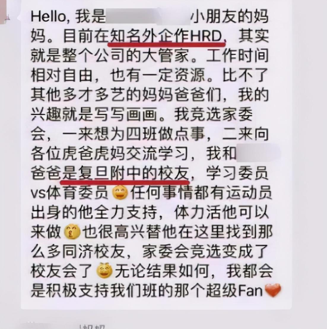 这位家长连上的哪所学校喜欢做什么都讲的一清二楚,真的是一点都不“低调”,首先介绍自己是整个公司的管家知名外企的HDR,而且有着一定的资源,这样高调的炫耀真的好高调。
