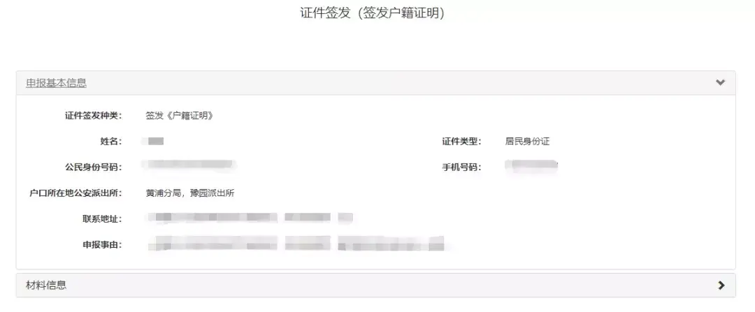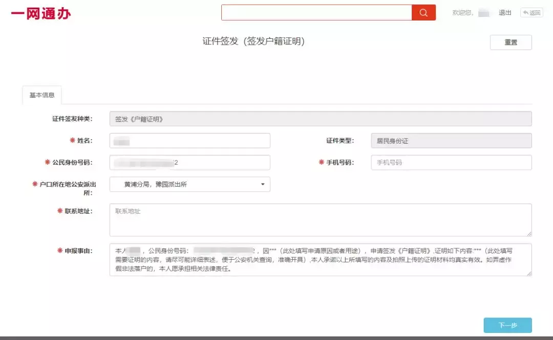 3.通过认证后,网页进入信息填写页面,“姓名”“身份证”“手机号码”等都已预先填写完毕,需要手动输入的是“联系地址”与“申报事由”;