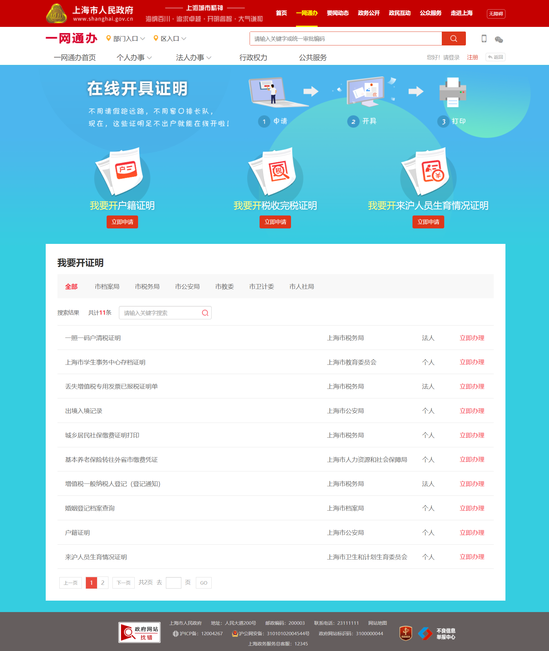 上月,上海“一网通办”总门户开通“在线开具证明”服务专栏,户籍证明、婚姻登记档案证明、社保缴费证明、税收完税证明等12类高频证明作为首批试点项目上线试运行,涉及公安、教委、人社、卫健、税务、档案等6个部门,除来沪人员生育情况证明外,都已实现“零材料”“零跑动”办理。