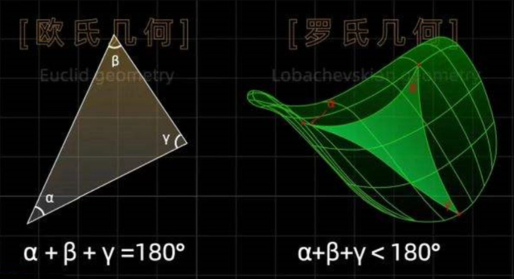 从这一逻辑上看,平行线可以相交,三角形的内角之和也可以大于或小于180°。