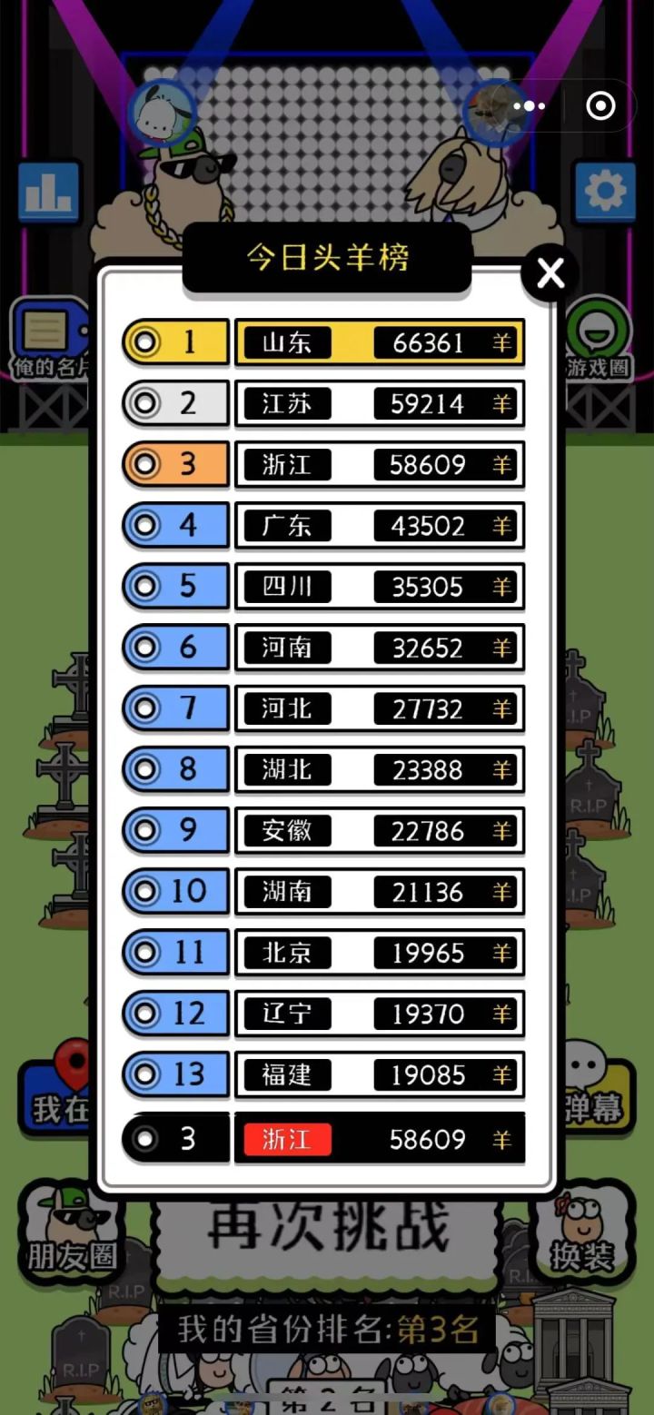 例如13日是地域划分的阵营挑战,玩家通关后能进入到省级地区榜单,助力当地排名。此番设计也极大地刺激了玩家参与度,不少网友纷纷表示要“为省出战”。最终,北京羊队位居第一,首个通关玩家则来自澳大利亚,最快通关纪录同样来自北京。