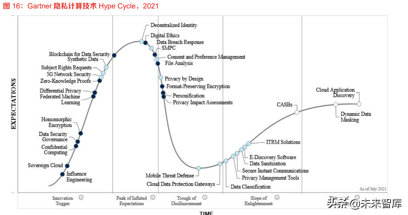 同态加密与差分隐私在隐私计算应用中的落地进程较缓慢。同态加密对于算力资源的需求极高, 现阶段常规 GPU 芯片无法满足同态加密所需求的算力,而同态加密的技术演进将不断提升算力 需求。因此同态加密的商用可能需要底层根据同态加密算法设计 ASIC 等专用芯片。另一个方面, 差分隐私的精准程度不高,长期而言在隐私计算中的独立应用前景较窄,但可成为辅助数据安全 与数据加密的增强应用。