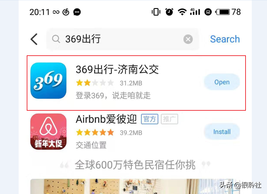 在手机中的应用商店里搜索“369出行”APP,下载并安装。