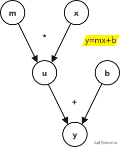 这是一个关于直线方程的计算图的例子。开始节点是你将在方程中看到的,为了计算图的方便,总是需要为中间节点定义额外的变量,在这个例子中是节点u。节点"u"等价于"mx"。