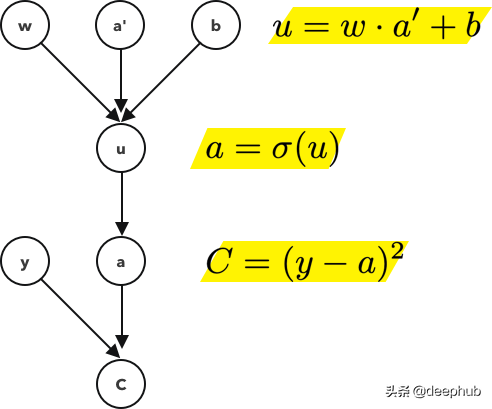 还记得之前,当我们把损失函数定义为差的平方,这就是我们在计算图的最后一层使用的。其中y是实际值a是预测值。