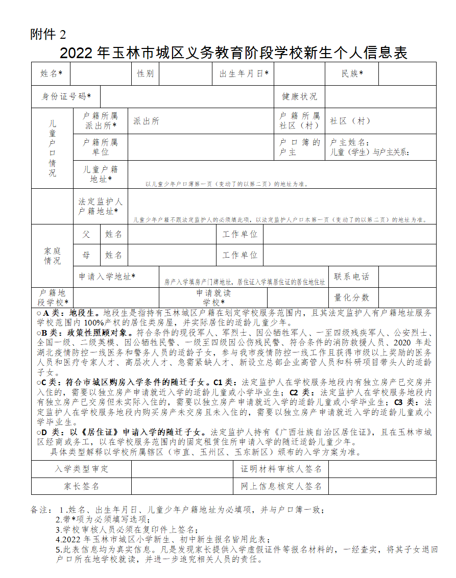 网上填报成功后,A类、B类、C类、D类新生家长自行打印《2022年玉林市城区义务教育阶段学校新生个人信息表》。根据疫情防控要求,由学校安排分批错峰到校,仅限一名新生家长和新生,携带信息表及相关材料于7月30日至7月31日到玉林高级中学附属初中进行原件验证。由学校新生工作组负责审核材料和填报信息,负责审核材料的老师须在材料复印件上验核签名。查验原件并存档复印件。如为现场报名的,学校审核材料的负责人对报名材料审核签名后,同时要把适龄儿童少年报名的信息录入新生入学系统。