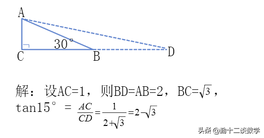 在△ABC中,∠ACB=90°,∠ABC=30°,那么我们可以延长BD,使得BD=AB,由此构造出等腰三角形ABD,且∠D=∠BAD=15°,根据锐角三角函数的定义求出15°角的正切值。