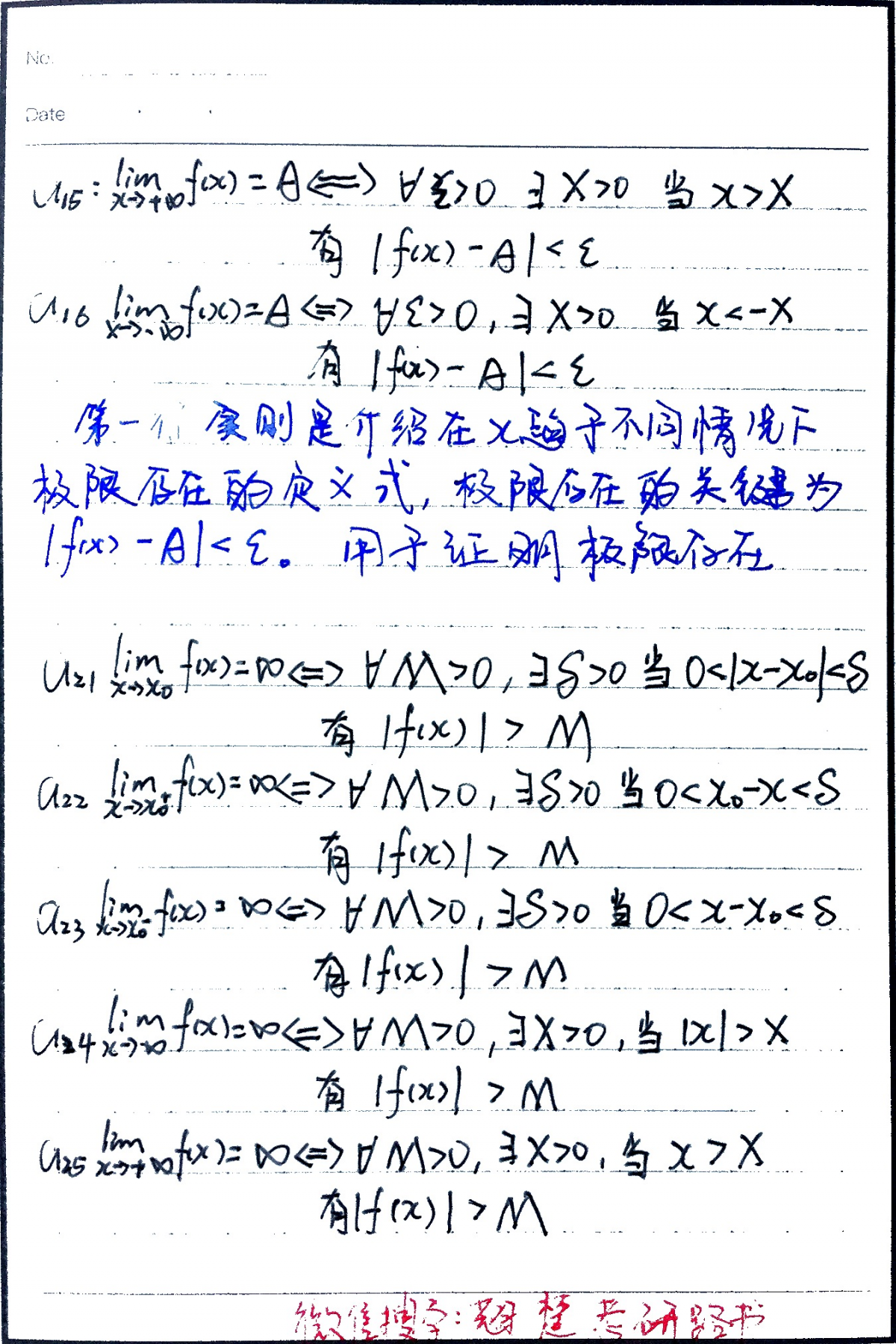值得注意的是,第一行的定义式是为了证明函数在某一个趋向过程中其极限为常数(即今后部分题目中遇到的证明极限存在)。而第二行到第四行可以称之为极限不存在(亦可用作极限不存在的证明中)。