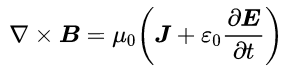 虽然还是有点长,但是相比积分形式已经是相当良心了,它告诉我们某一点感生磁场的旋度▽×B等于电流密度J和电场变化率∂E/∂t两项的叠加。其实它跟积分形式讲的都是一回事,都是在说电流和变化的电场能够产生一个磁场,只不过积分形式是针对一个曲面,而微分形式只是针对一个点而已。