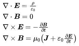 至此,麦克斯韦方程组的四个方程:描述静电的高斯电场定律、描述静磁的高斯磁场定律、描述磁生电的法拉第定律和描述电生磁的安培-麦克斯韦定律的微分形式就都说完了。把它们都写下来就是这样: