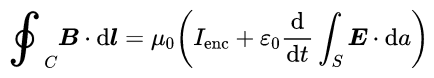 左边的磁场的环流,右边是曲面包围的电流(带enc下标的I)和电场的变化率。它告诉我们,如果我们画一个曲面,通过这个曲面的电流和这个曲面里电通量的变化会在曲面的边界感生出一个旋涡状的磁场出来,这个旋涡状的磁场自然是用磁场的环流来描述。