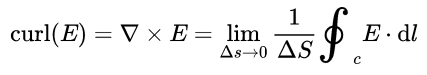 也就是说,我们让▽算子以叉乘的方式作用在电场E上,我们就得到了电场E的旋度▽×E,而这个旋度的另一种定义就是我们上面说的无穷小非闭合曲面的环流和这个曲面的面积之比。因为旋度的英文单词是curl,所以我们用curl(E)表示电场的旋度。所以,我们就可以写下下面这样的式子: