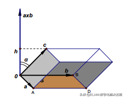 以向量a,b,c为棱的平行六面体的底(平行四边形0ADB)的面积S在数值上等于|a×b|,它的高h等于向量c在向量 a×b上的投影,即h =|c| cos a ,所以平行六面体的体积等于