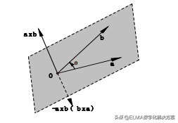 a × b为一个新生成的向量,这个向量垂直于a 和 b展成的平面(图中的虚线平行四边形,由线段oa和ob 所确定的平面);同样向量b × a也垂直这个平面,但方向与a × b所指的方向相反,即a × b = b × a;(右手法则)