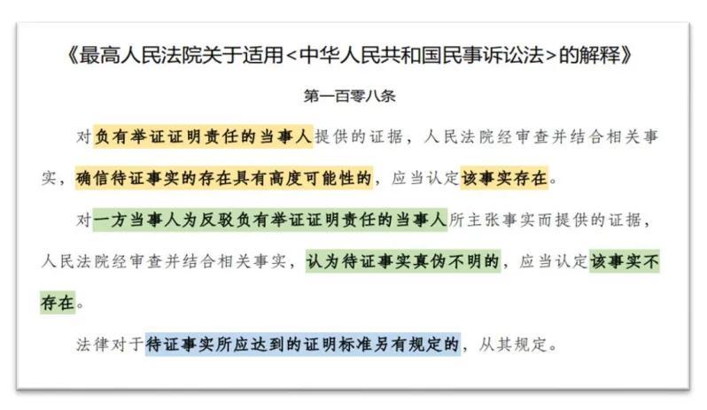 《民诉法司法解释》第一百零八条:“对负有举证证明责任的当事人提供的证据,人民法院经审查并结合相关事实,确信待证事实的存在具有高度可能性的,应当认定该事实存在。对一方当事人为反驳负有举证证明责任的当事人所主张事实而提供的证据,人民法院经审查并结合相关事实,认为待证事实真伪不明的,应当认定该事实不存在。法律对于待证事实所应达到的证明标准另有规定的,从其规定。”