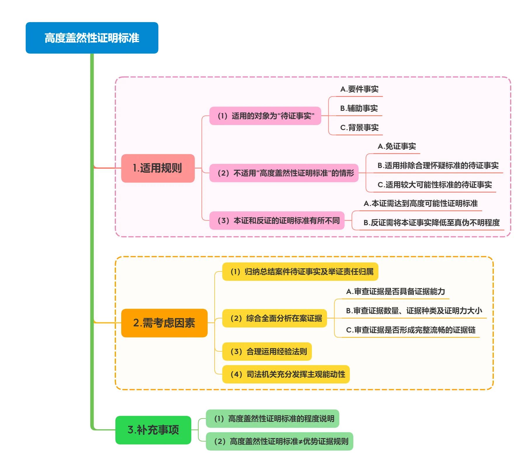 对于“欺诈、胁迫、恶意串通的事实”,因该类事实带有较强的主观性,且该类事实的存在与否直接关系到民事法律行为的效力(如行为人与相对人恶意串通,损害他人合法权益的民事法律行为无效),进而会影响法律秩序的稳定性与市场交易的安全性,故对于此类事实需要极为严格的证明标准;对于“口头遗嘱或口头赠与的事实”,因该类事实的存在与否直接关系到相关财产的权属,且获得财产(如遗产或赠与财产)的一方获得利益一般并未付出对价,故对于该类事实亦需要极为严格的证明标准。②高度盖然性证明标准:适用的是“民事诉讼案件的一般性待证事实。”该标准适用的待证事实一般为“关系到案件当事人权利义务或影响案件判决结果的待证事实”。
