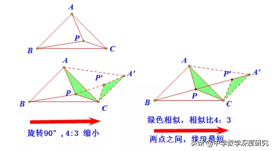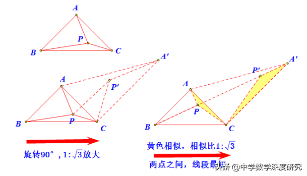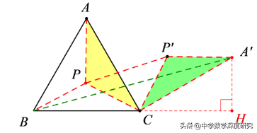 1 AP´转化为PP´;②BPP´C四点共线.故而有∠PAP'=60°(易得旋转60°),