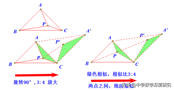 解题之本:我们知道PA、PB、PC二条线段是极度分散的,利用两点间线段最短或者垂线段最短都不行,那首先要想力法将分散的线段集中起来,这样才能进行数学分析。