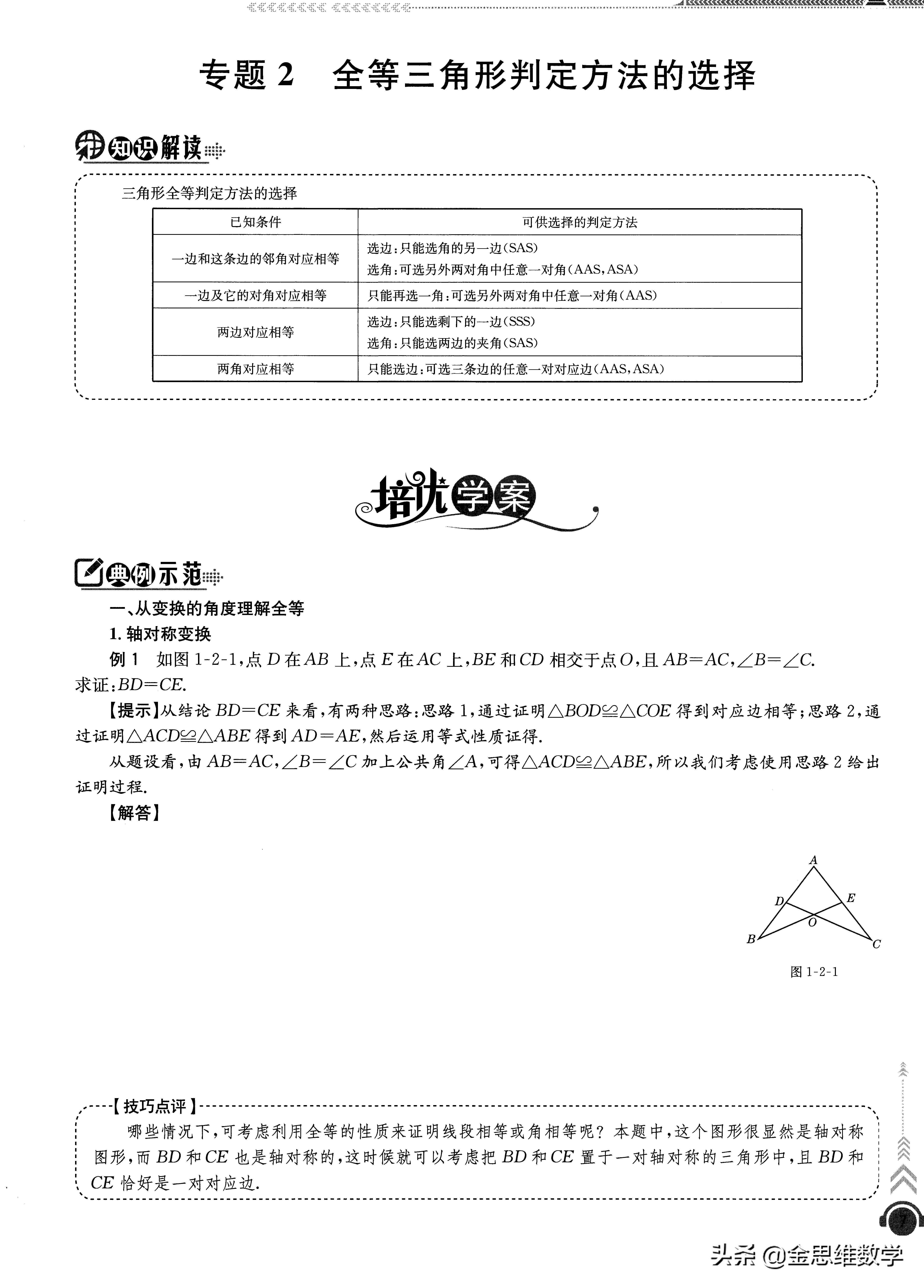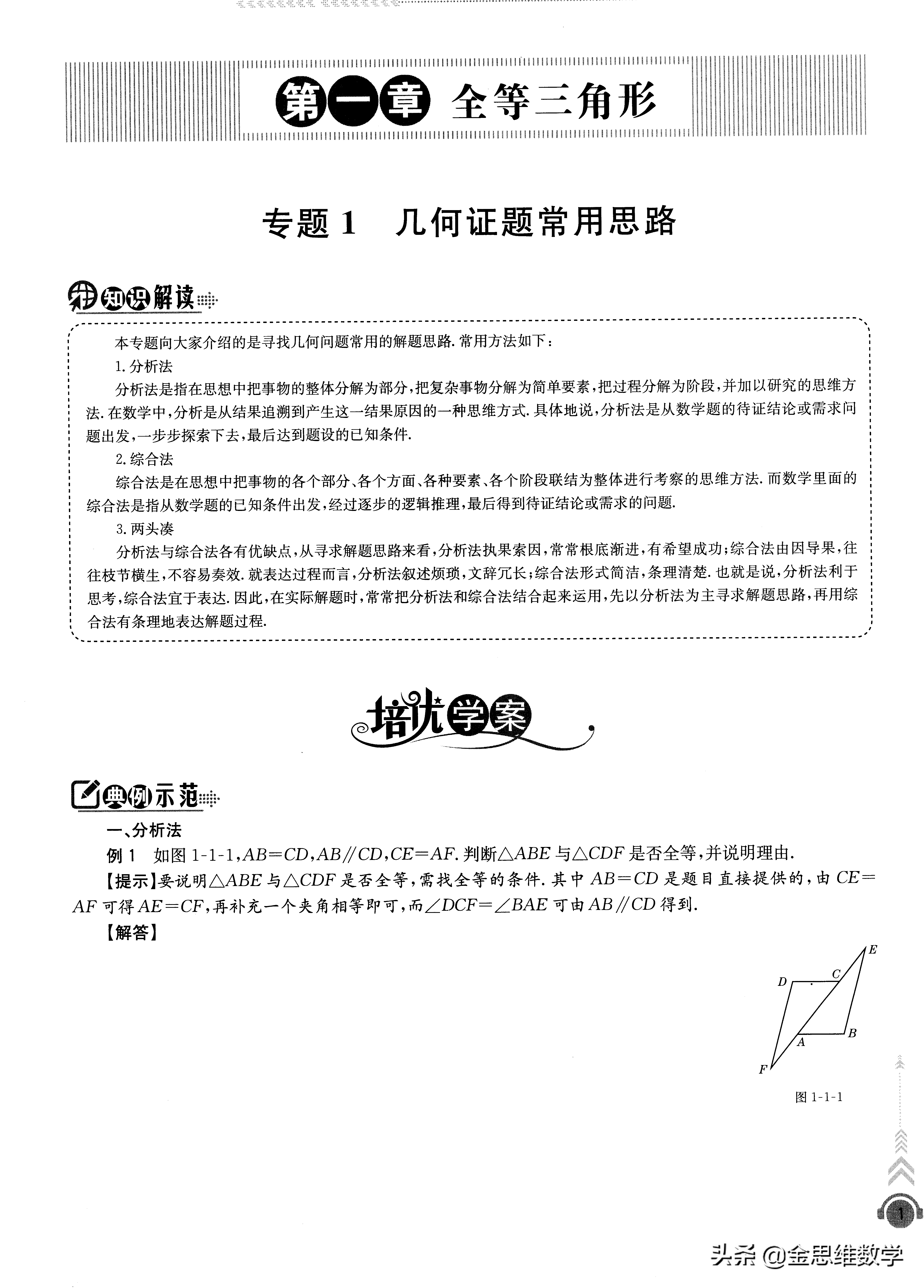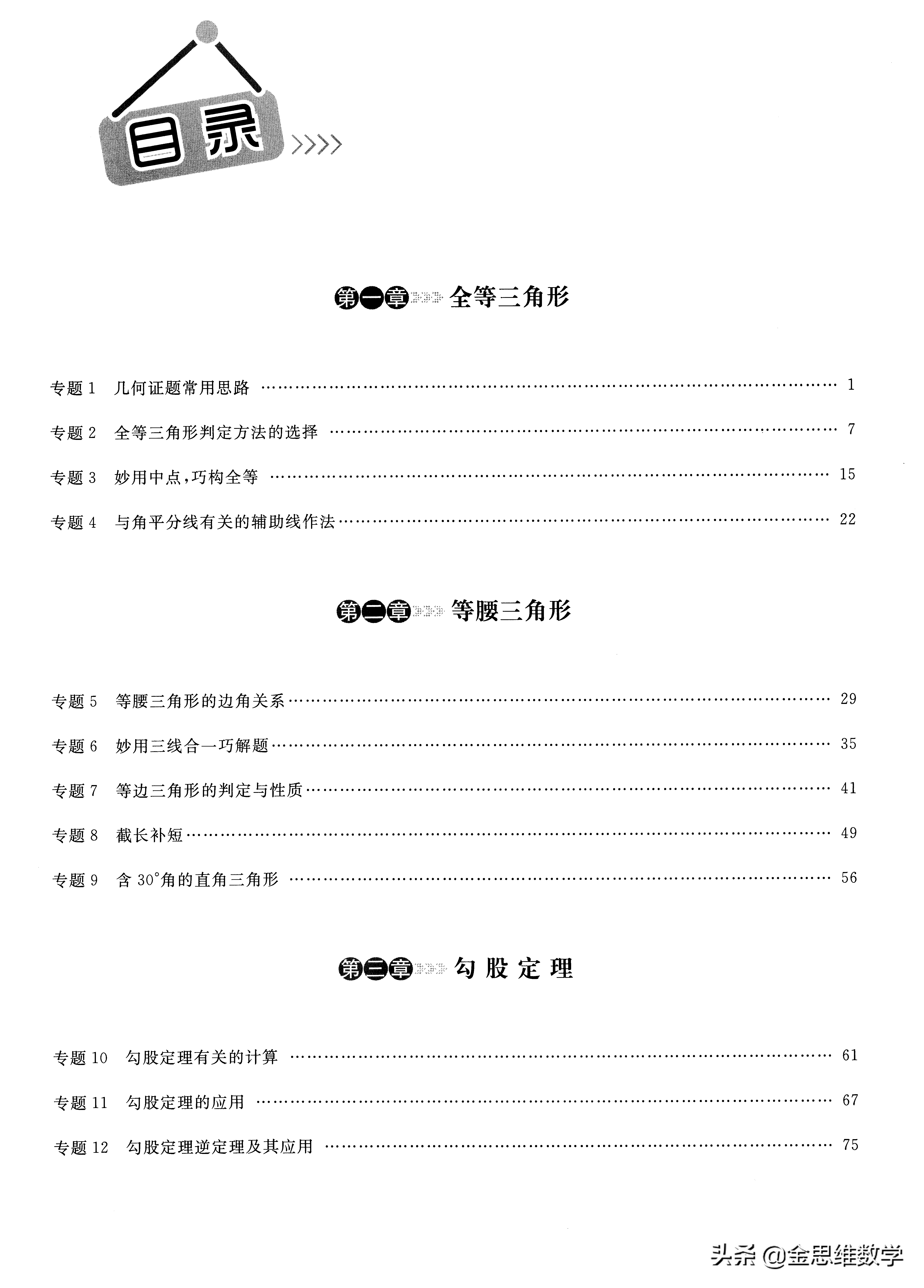 专题1几何证明题的常用思路专题2全等三角形判定方法的选择目录1