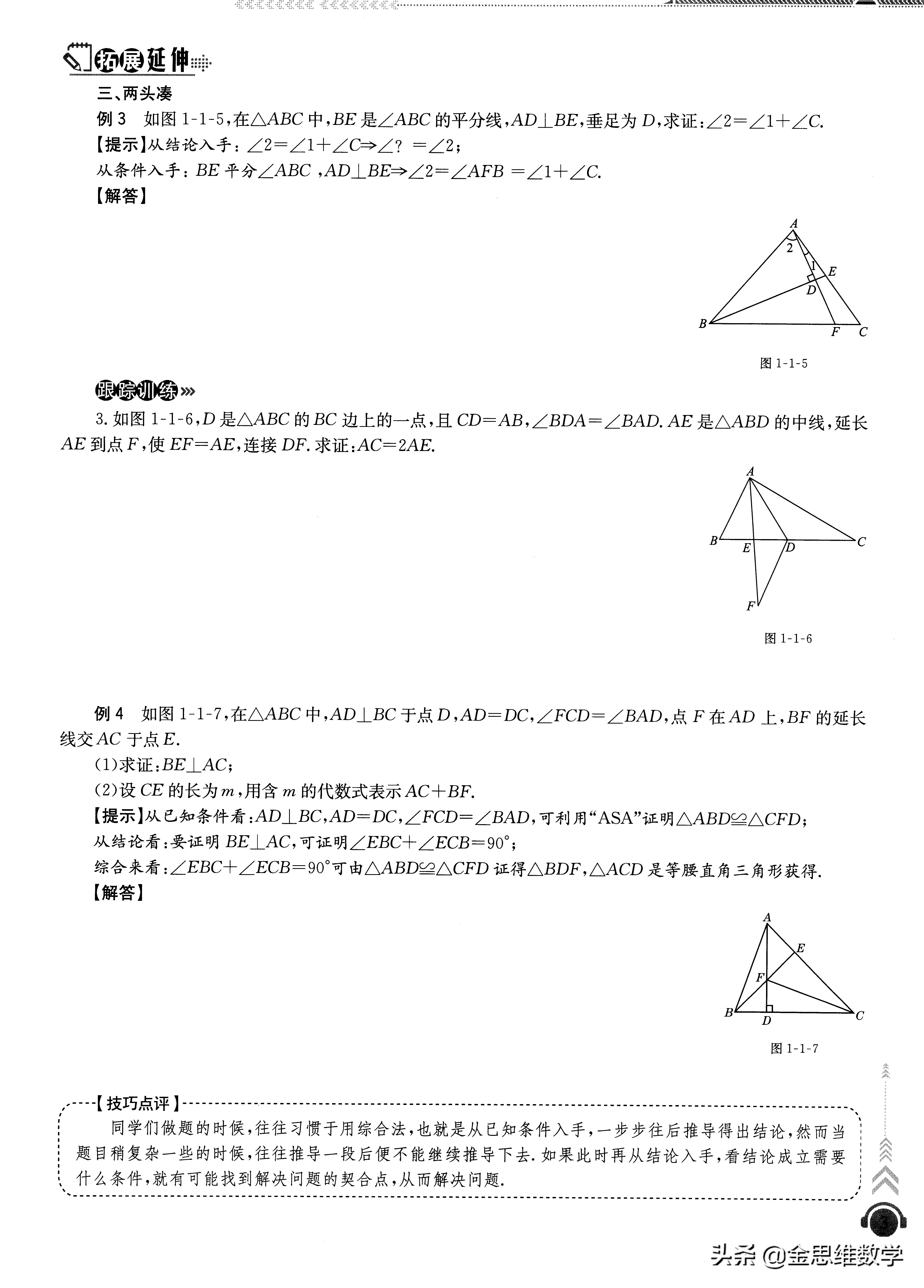 3.两头凑:把分析法和综合法结合起来运用,先以分析法为主寻求解题思路,再用综合法有条理地表达解题过程。
