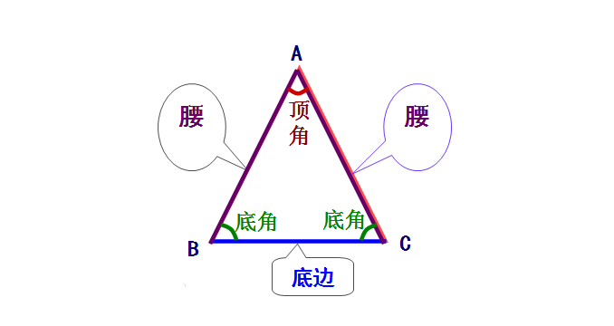 等腰三角形中,相等的两条边称为这个三角形的腰,另一边叫做底边。两腰的夹角叫做顶角,腰和底边的夹角叫做底角。
