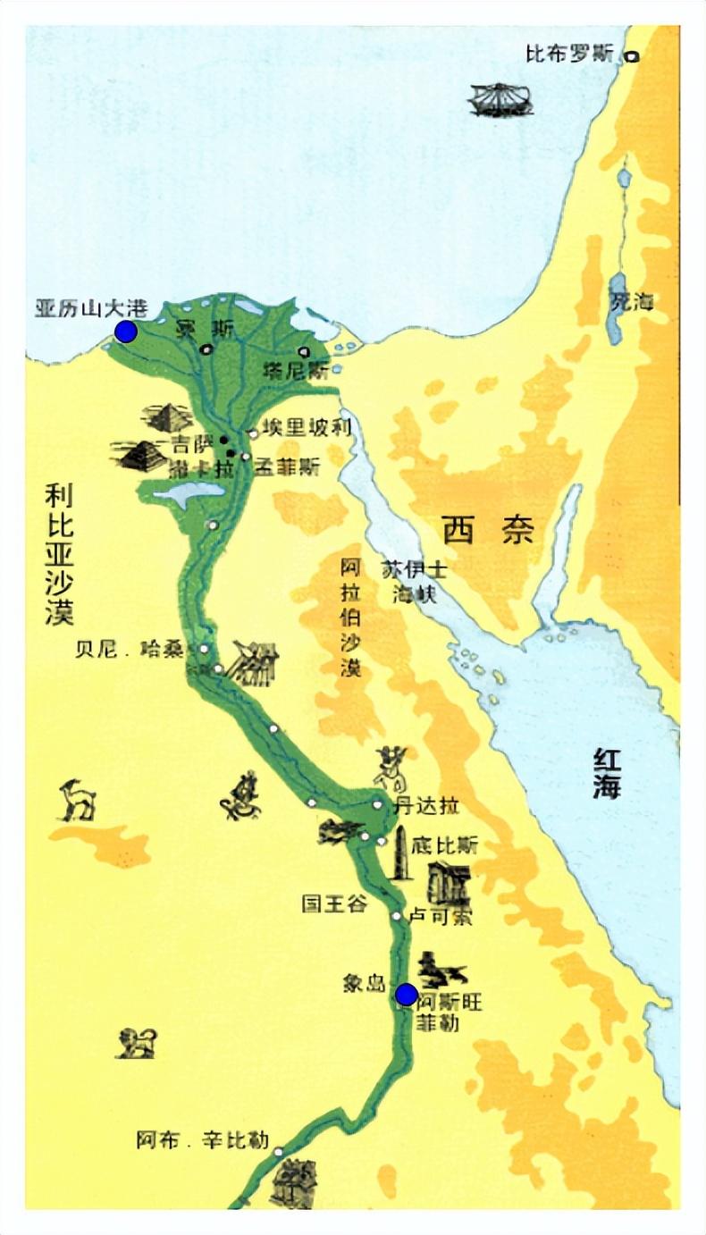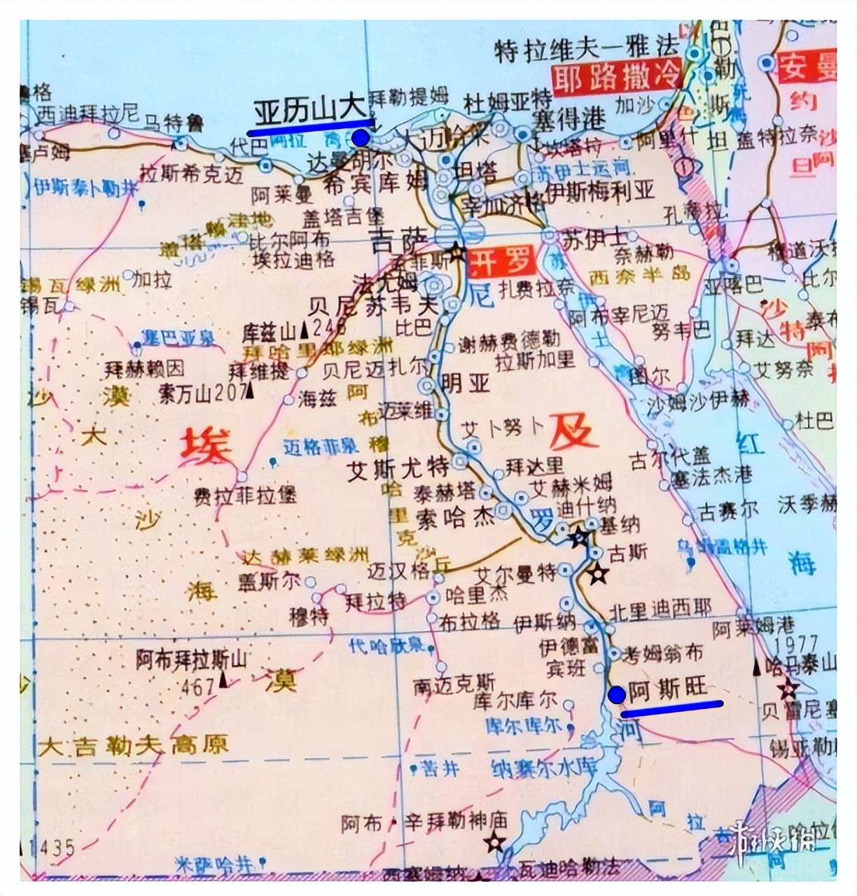 疑点一:请看下面的埃及地图,两个蓝色圆点的位置就是亚历山大港和塞伊城附近的阿斯旺,两地的800千米路程到底是怎样测量出来的?上图绿色部分是尼罗河谷地,周围黄色部分是人迹罕至的热带沙漠,两千多年前的古埃及人只能用脚步沿尼罗河谷地弯弯曲曲地丈量路程。这个误差和直线距离应该会比较大,怎么会恰好是整数800千米?