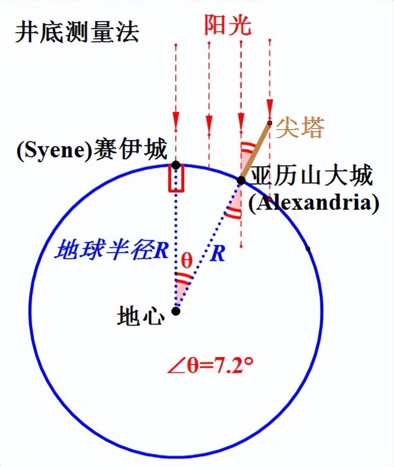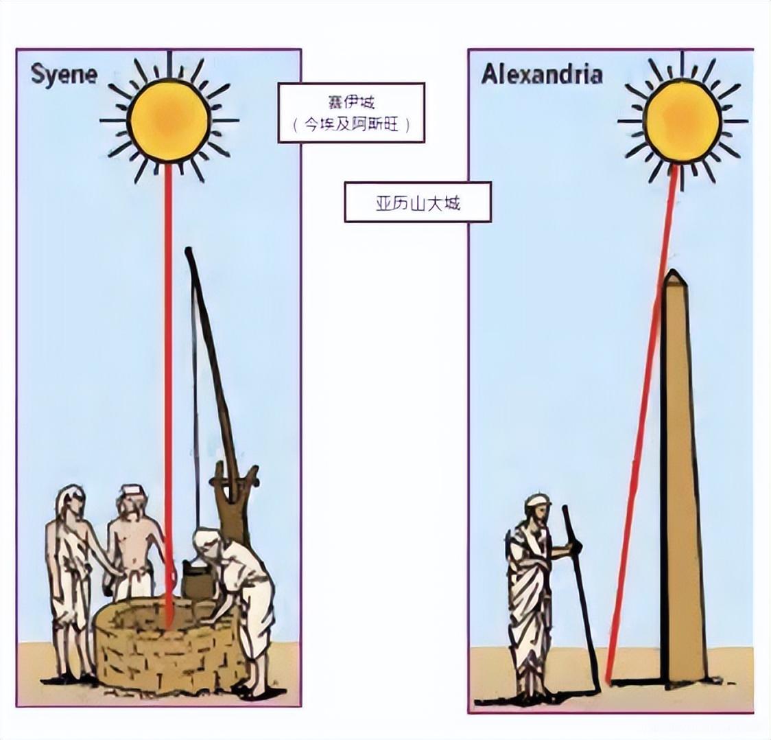 有一天,老埃发现在赛伊尼(今天埃及阿斯旺附近)有一口井, 每到夏至日的时候就会发生一件事:太阳光直射井底 。(没有想到这口井应该在北回归线以南的同学该加油了), 但是在距离塞伊尼800km以外的亚历山大城地面上,一座尖塔却有一段很短的影子。老埃认为 , 这是因为亚历山大城的阳光与直立物体形成的夹角所造成的。该放图了