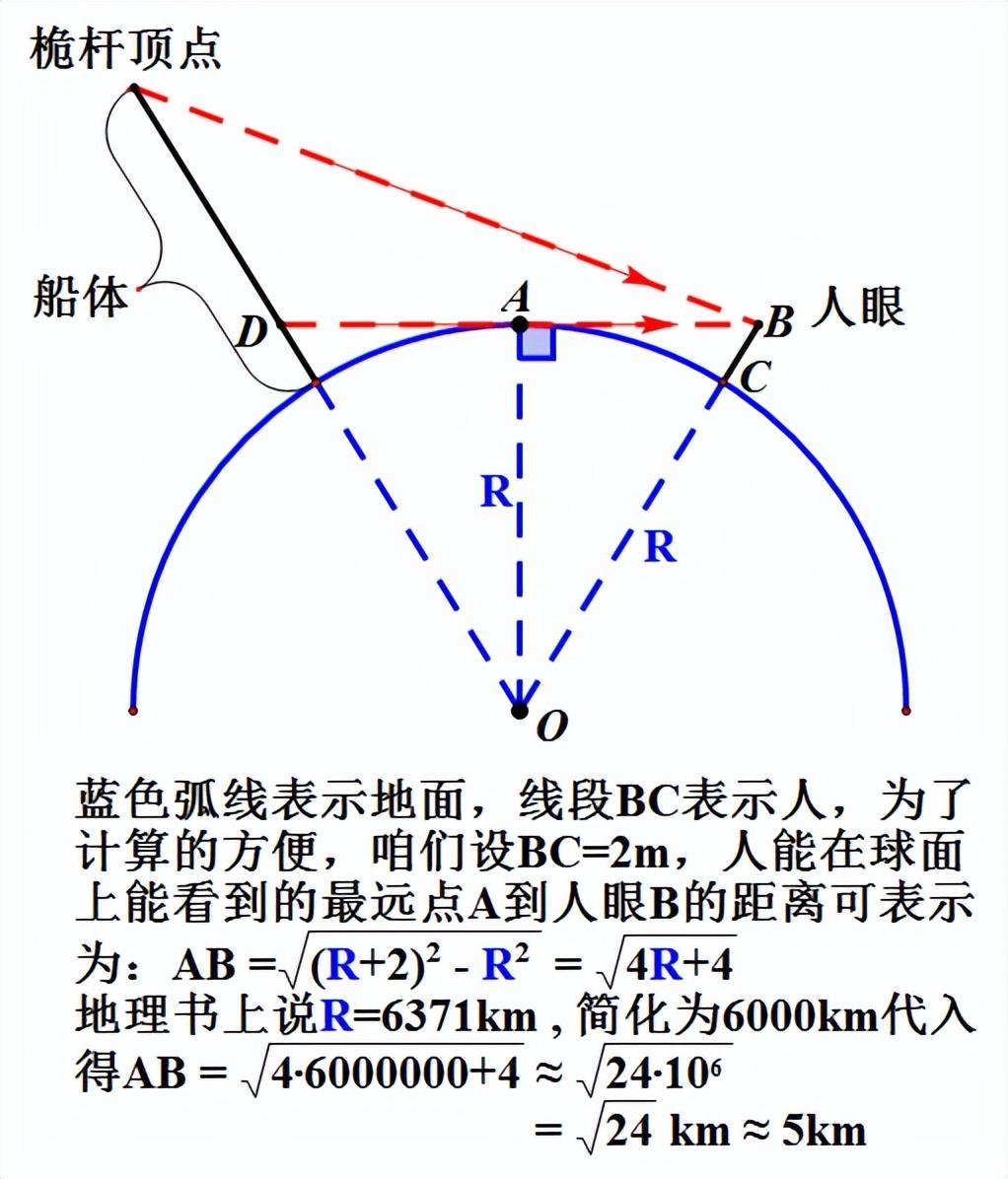 疑点一:我没有在海边看过帆船,相信多数人和我一样,但不妨碍我们做个推理。两千三百多年前的亚里士多德时代,帆船能有多高,据说现今世界最大的货轮水面上高60米,帆船姑且算30米高吧。离多远才能看到帆船呢?大家跟我一起用初中二年级的数学知识计算一下吧,如下图