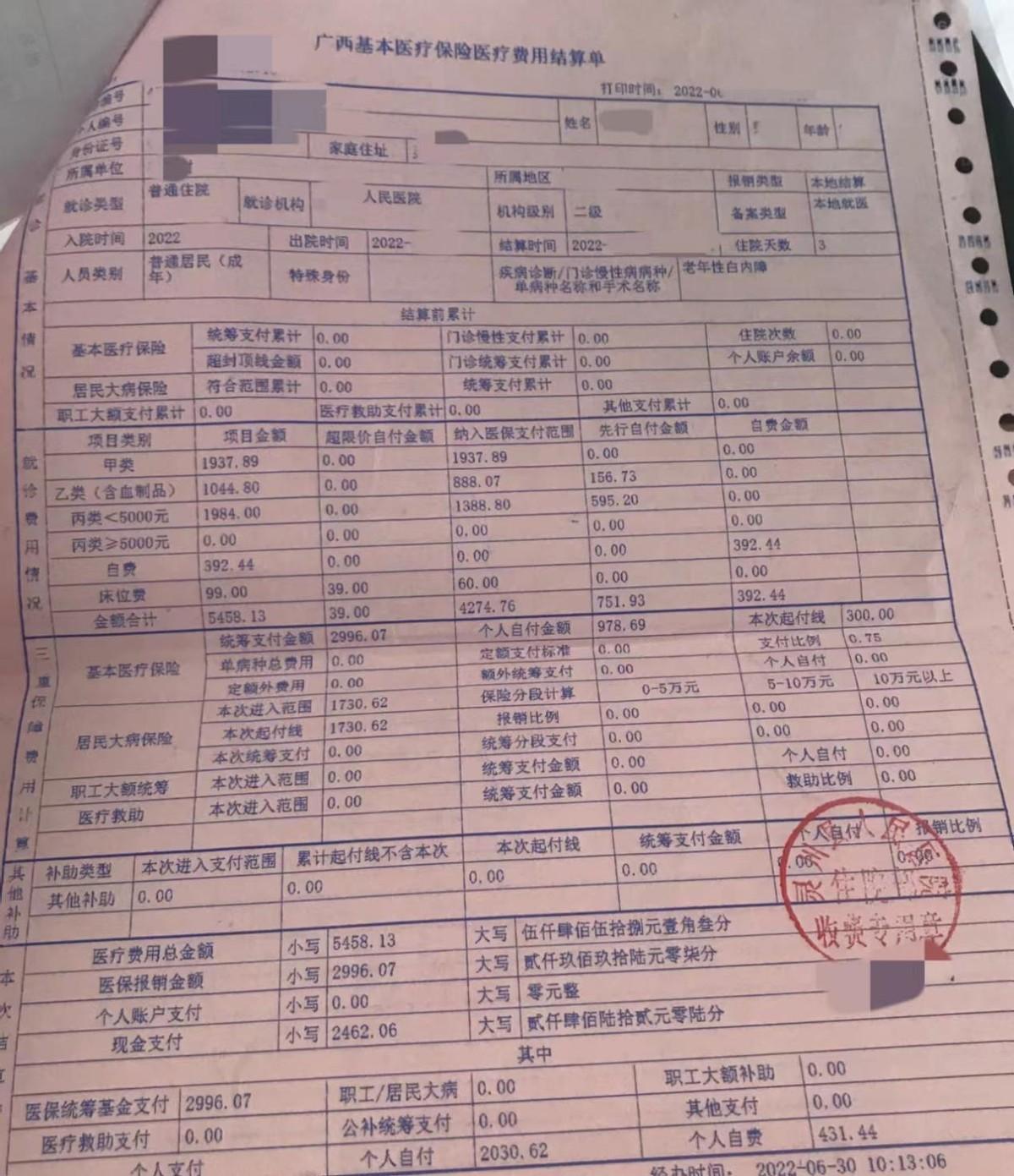 广西桂林一位53岁男士,因“老年性白内障”,前往灵川县人民医院住院治疗。医疗费用总计5458.13元,医保报销2996.07元,剩余2462.06元。减去自费金额、分类自付金额后,剩余费用报销90%,最终赔付1171.21元。
