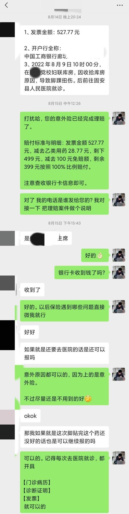 河北省廊坊市某机关单位,招聘了百名大学生作为实习员工,并分派到各单位实习。理赔频率也比较高,这里举某位员工意外扭伤理赔案例。赔付金额399元。