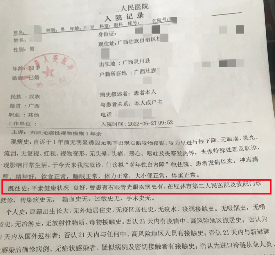 在入院记录的既往病史里,有写明“曾患有右眼青光眼疾病史,在桂林市第二人民医院及我院门诊就诊”。