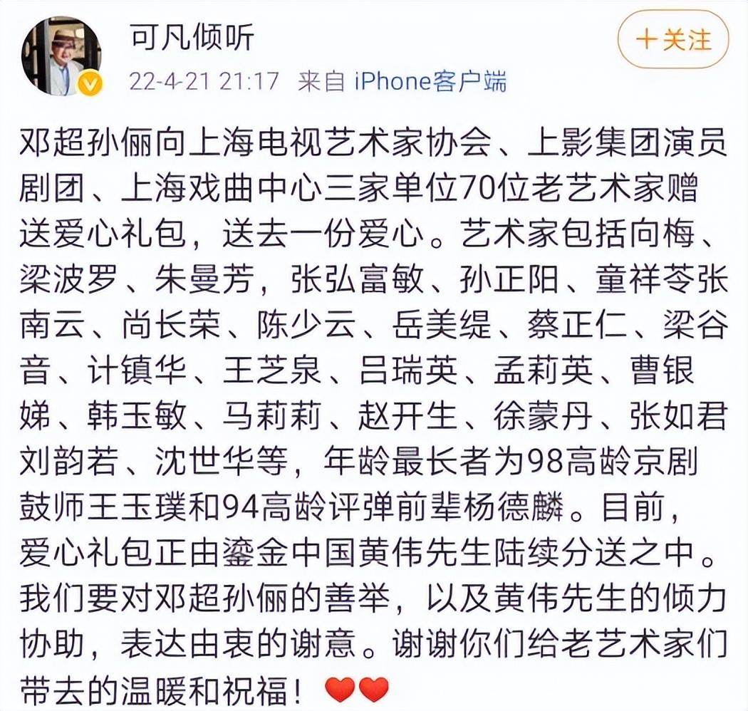 内容是感谢邓超孙俪夫妇对一批人的捐赠,
