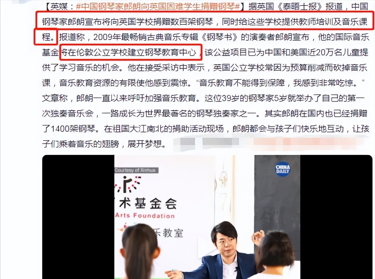 同样是前几天,著名钢琴家郎朗给英国捐助百架钢琴的新闻也被某著名媒体转发,