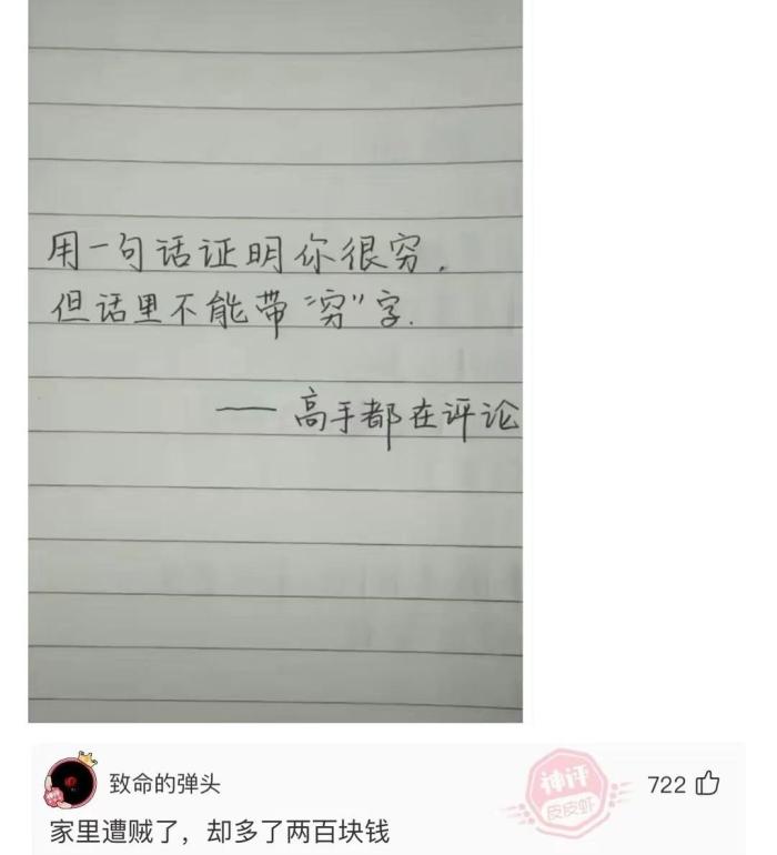 版权声明:我们致力于保护作者版权,注重分享,被刊用文章【用一句话证明你很穷(网友爆笑神评论)】因无法核实真实出处,未能及时与作者取得联系,或有版权异议的,请联系管理员,我们会立即处理! 部分文章是来自自研大数据AI进行生成,内容摘自(百度百科,百度知道,头条百科,中国民法典,刑法,牛津词典,新华词典,汉语词典,国家院校,科普平台)等数据,内容仅供学习参考,不准确地方联系删除处理!;