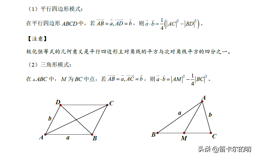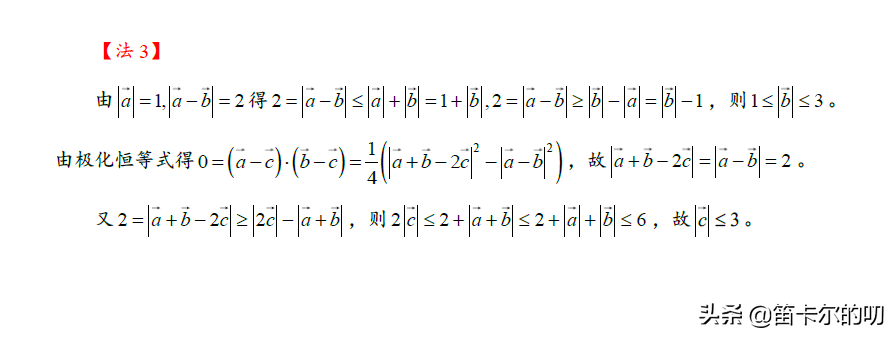 法3,首先利用绝对值三角不等式求得│b│的范围(事实上只需最大值),然后利用极化恒等式(见脑洞)将向量的数量积转化为模,最后借助绝对值三角不等式求出结论。
