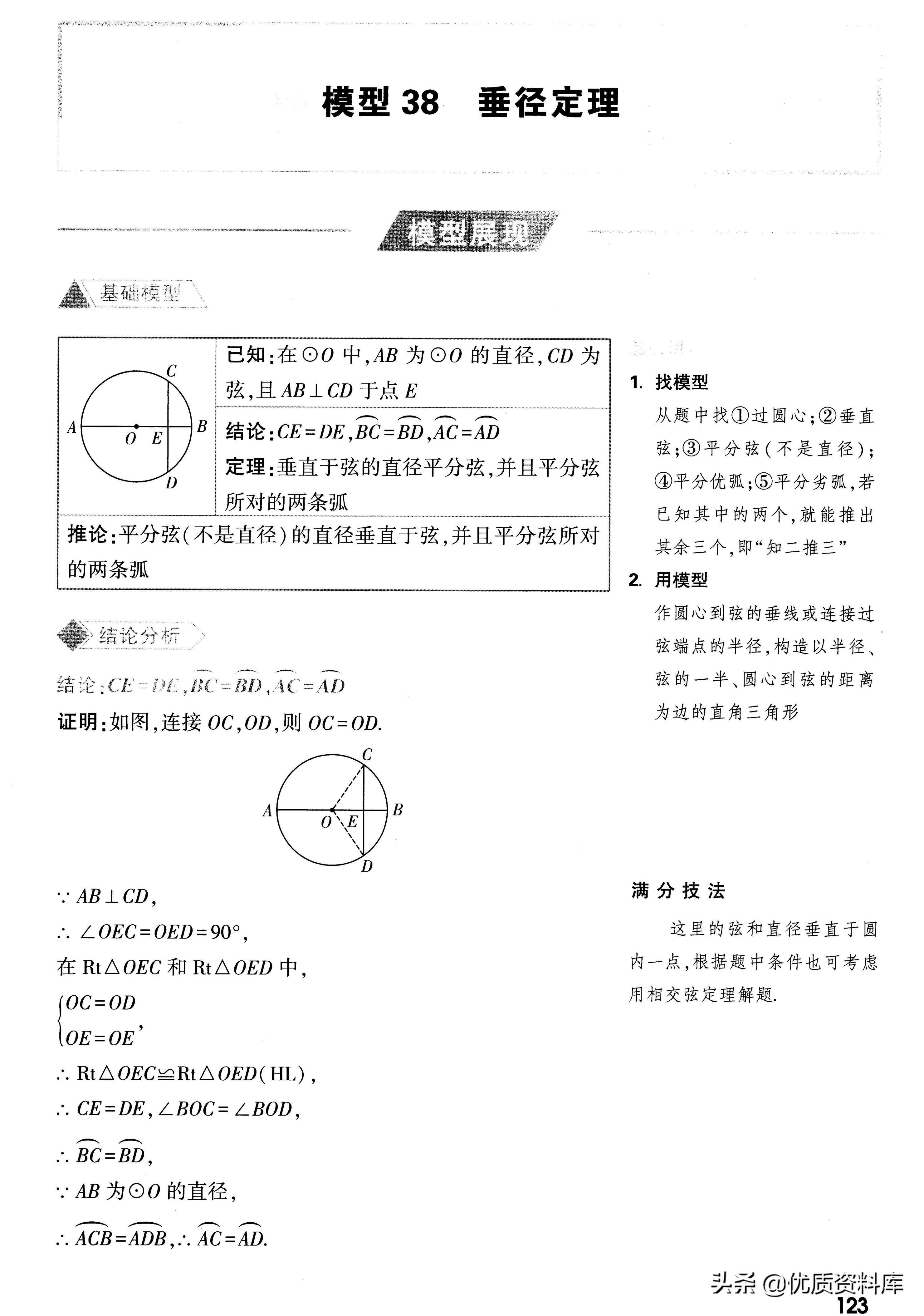 ①过圆心:②垂直弦:③平分弦(不是直径):④平分优弧:⑤平分劣弧,