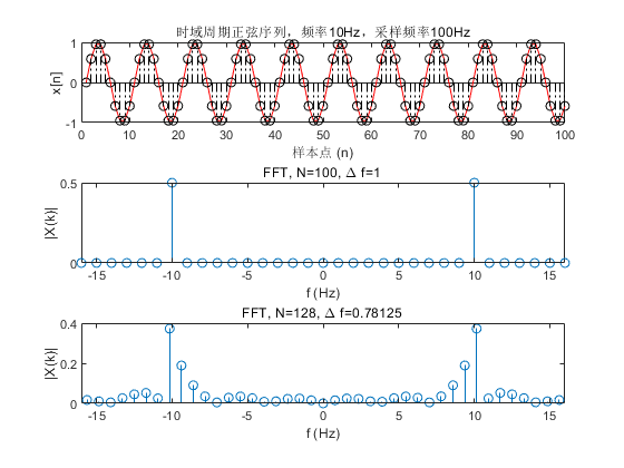 FFT大小n与信号样本的长度相同,即n=100;FFT大小设置为2的下一次幂,该次幂符合信号样本,即n=128;结果绘制如下: