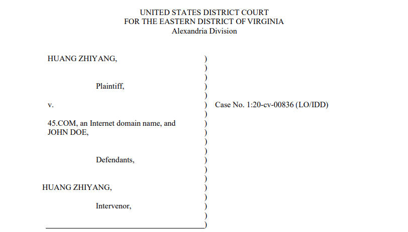 本案起诉人“黄志阳A”于2020年7月向美国弗吉尼亚州北区法院提起诉讼,声称有人入侵了他的账户并窃取了他名下的域名<45.com>。