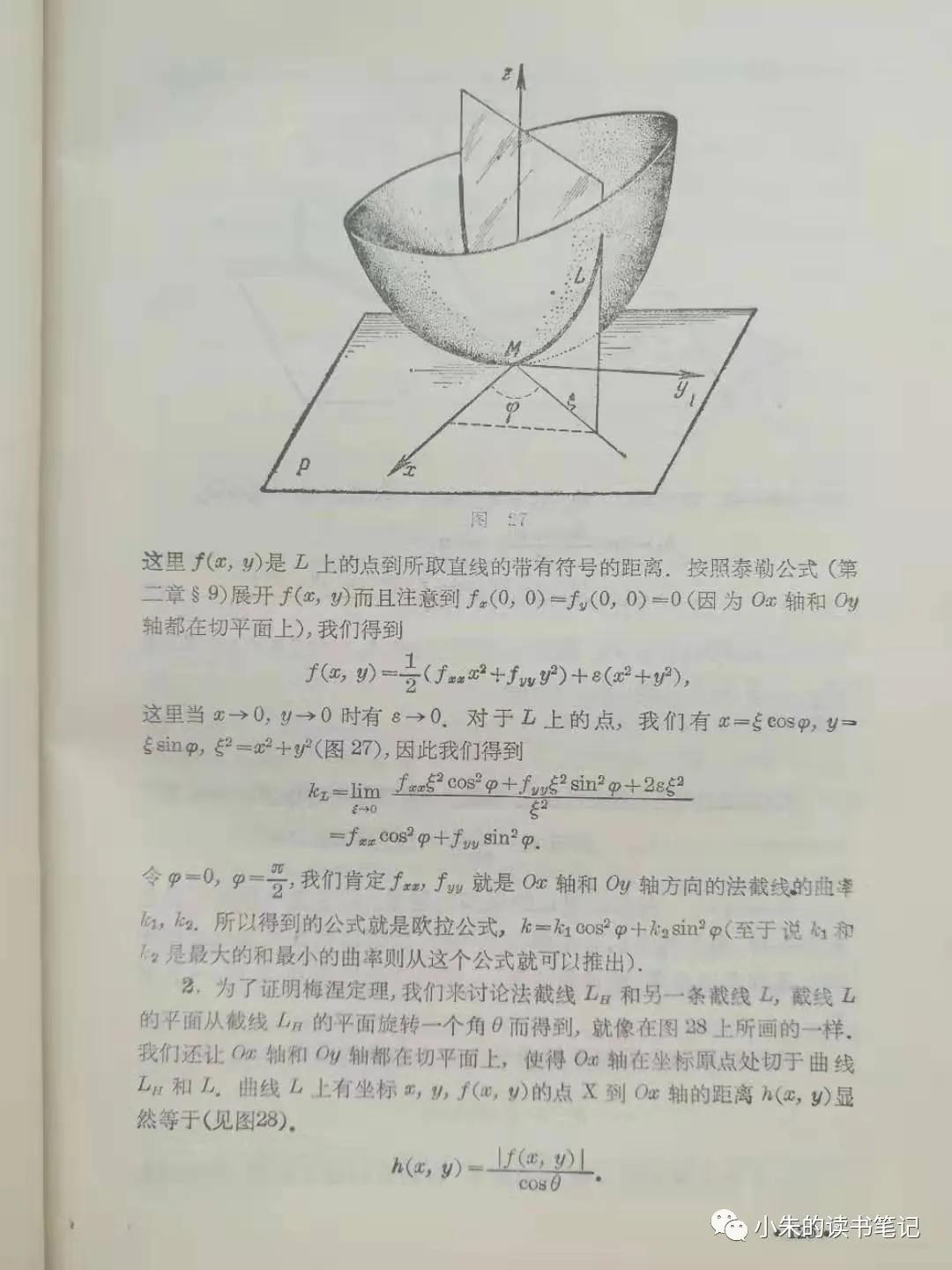 《数学》的第二卷第七章专门讲解了微分几何这门课程的基本想法。首先作者详细解释了平面曲线的曲率概念,并且推导出了曲率计算公式,特别是给出了曲率的一个直观的几何解释:曲率是曲线离开切线的速度。然后作者在讨论光滑曲面的弯曲时,就按照欧拉的方法,用通过曲面法线的平面与曲面相交,从而得到一族法截线。这些法截线都是平面曲线,因此就可以运用它们的曲率来刻画曲面的弯曲程度。接下来,作者用了18世纪的数学家们所熟悉的简单直观的方法,来证明上述计算法曲率的欧拉公式,这个证明方法仅仅用到了平面直角坐标系的旋转公式和二元函数的泰勒展开公式,以及前面由作者给出的平面曲线曲率的几何解释(见下图):