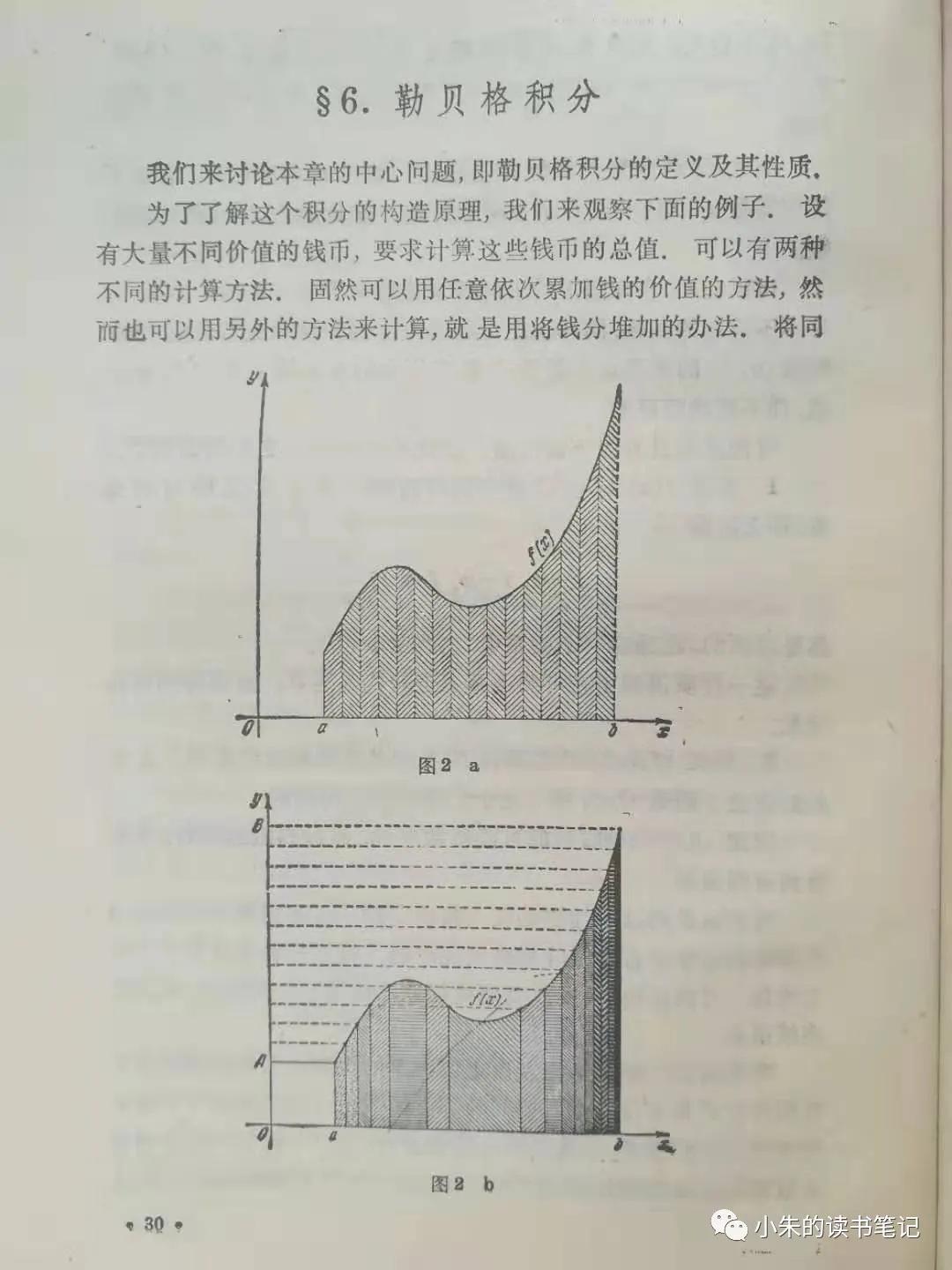 作者首先讲了集合和运算和实数的基本性质,然后开始介绍开集与闭集的测度的概念,在这里,作者采用了一种比通常教科书上的定义大为简化了的测度定义(也是一种早期的测度定义),虽然现在课本上的测度定义更为一般,但是这个简化了的测度定义却能够使读者更加容易地理解可测集与可测函数这两个最基本概念的内在含义。接下来,作者运用了一个数钱币的比喻来揭示勒贝格积分的基本思想,即如果有大量的不同价值的钱币,要求计算这些钱币的总价值是多少,那么就有两种不同的计算方法。第一种方法是依次累加,第二种方法是先将同样价值的钱币放在一堆,再用每一堆钱币的个数乘以这堆钱币的单价,然后将所得到的这些数值加起来即可。第一种方法对应了黎曼积分的过程,而第二种方法则对应了勒贝格积分的过程。这个非常简单的比喻可以进一步发展成用两种图形划分的方法来计算函数f(x)在闭区间[a,b]上的曲边梯形: