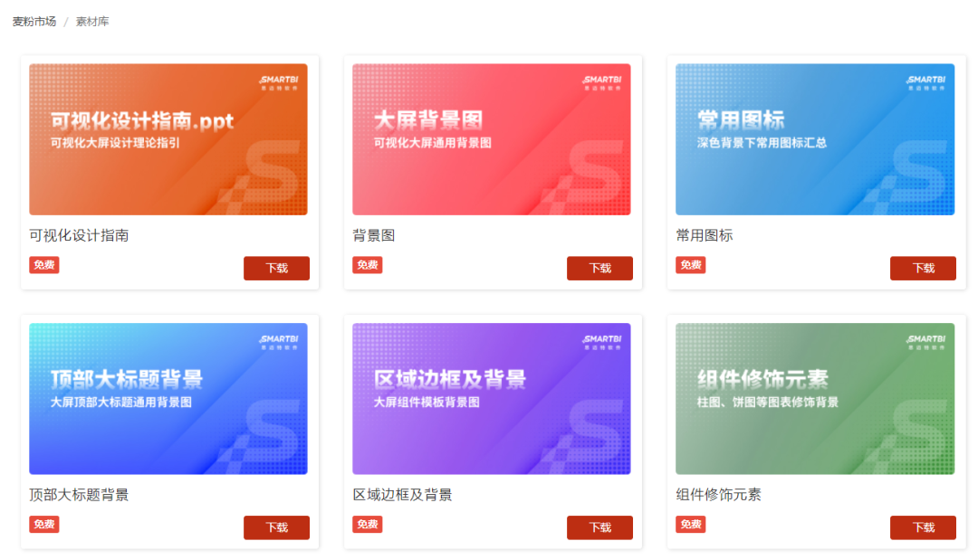 此外,为了更好的帮助大家进行可视化大屏开发,Smartbi不仅提供《可视化设计指南》指引开发,还提供了一批常用的图片素材供下载使用,包括:大屏背景图、组件背景图、标题背景图、边框、常用图标、组件修饰元素等。