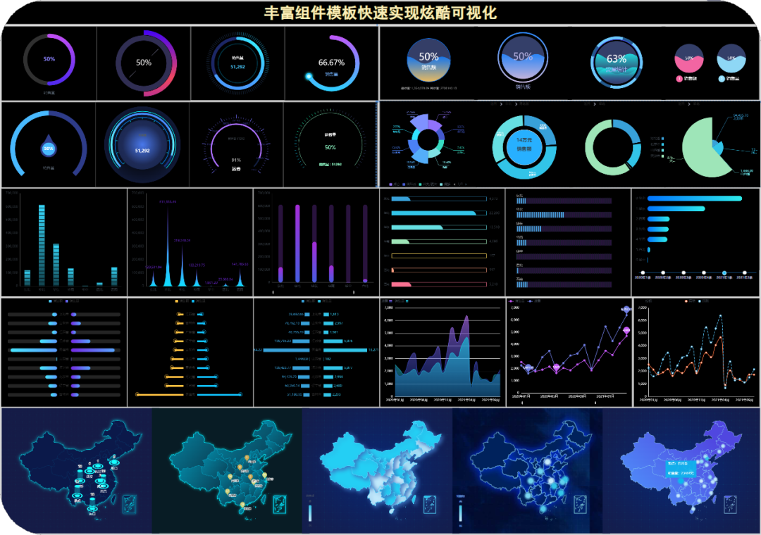 还提供丰富美观的组件模板供用户选择复用;同时提供各种便捷操作如辅助线、鹰眼功能等让大屏制作精准排版、快速布局;并支持同期、前期、累计、排名、占比等快速计算,不再用写复杂SQL,点点鼠标就能实现复杂计算等。(详细了解点这里)。
